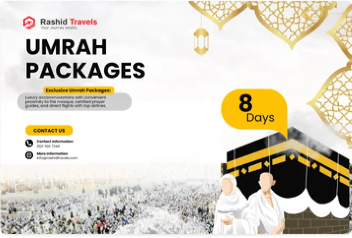 Affordable 8-day Umrah with 3-star hotels near Haram & Prophet’s Mosque, flights, visa, and guided support included.